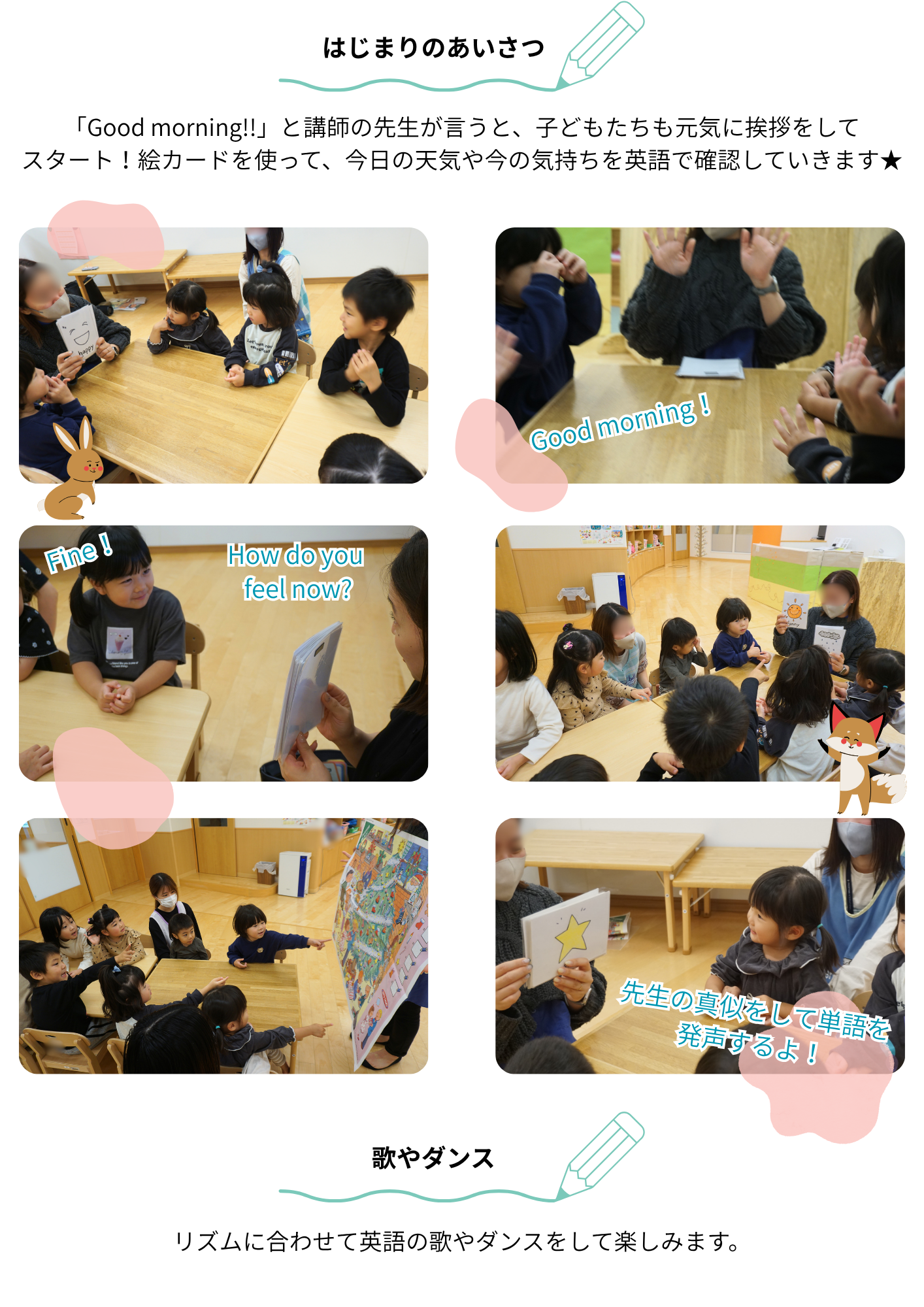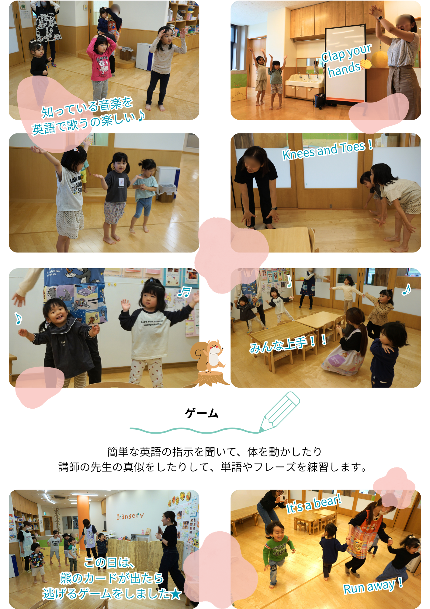 外部カリキュラムとして体操教室のほかに、英語あそびがあります。