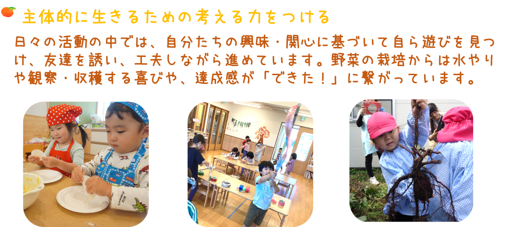 オランジェリー秋田保育園では、保育理念である「生き抜く力を育む」を基に、今年も「じぶんでできた!」をひとつでも多く感じることができる主体性を大切に、一人ひとりの力と可能性を信じて見守ってまいります。